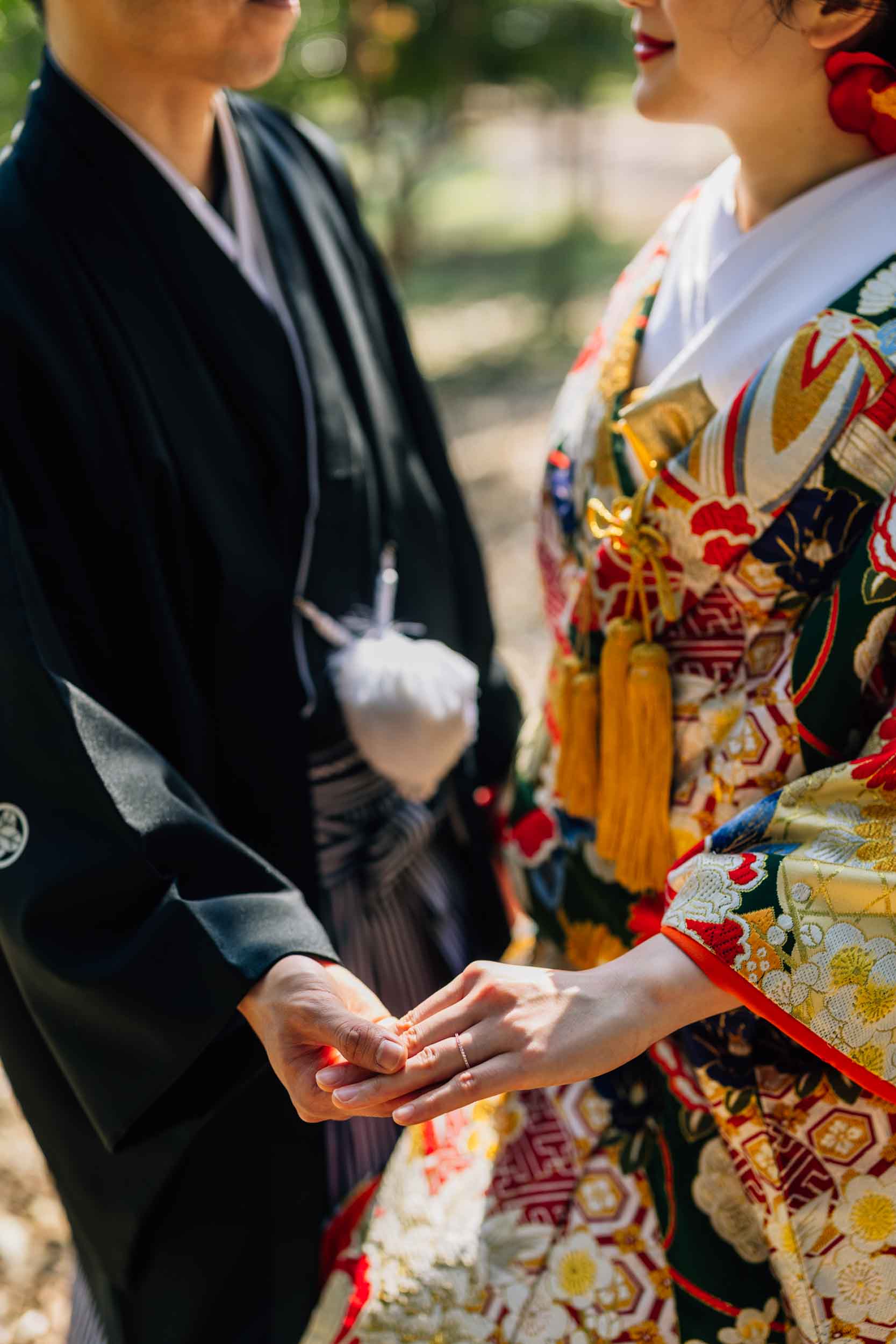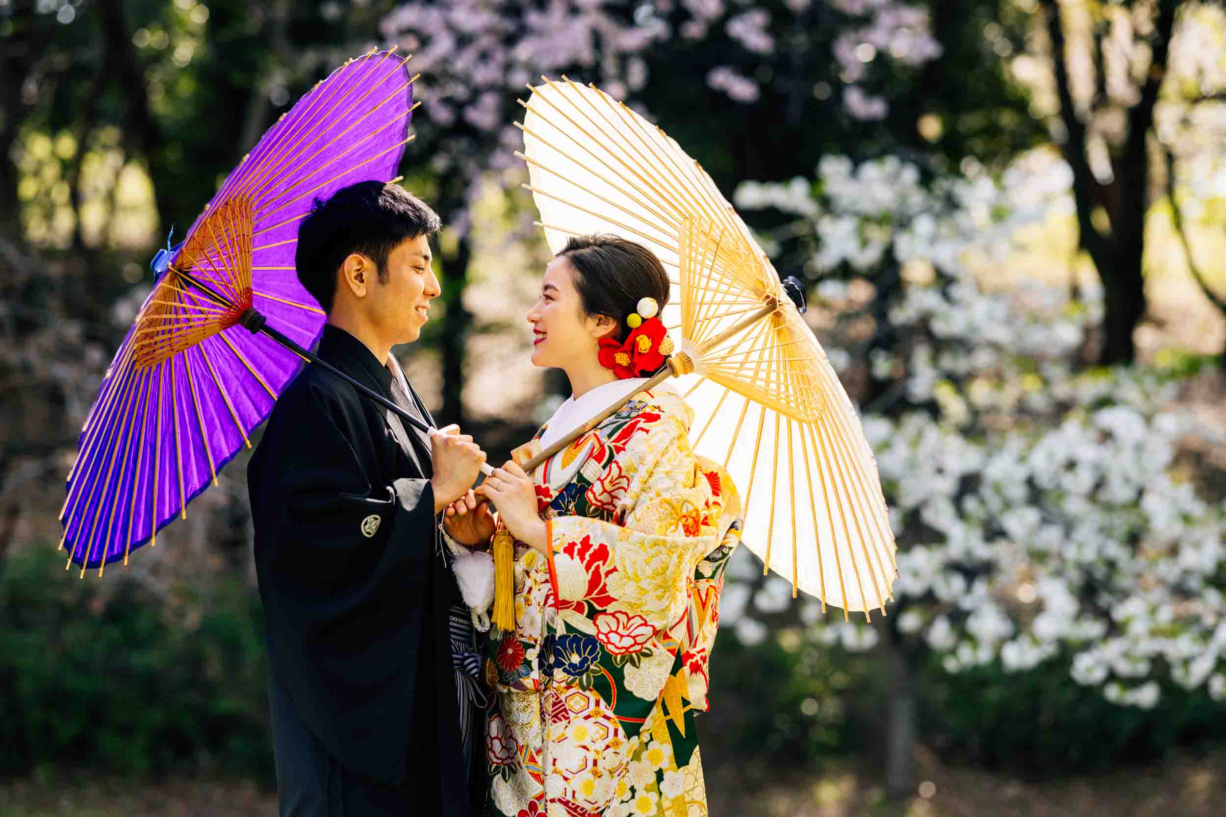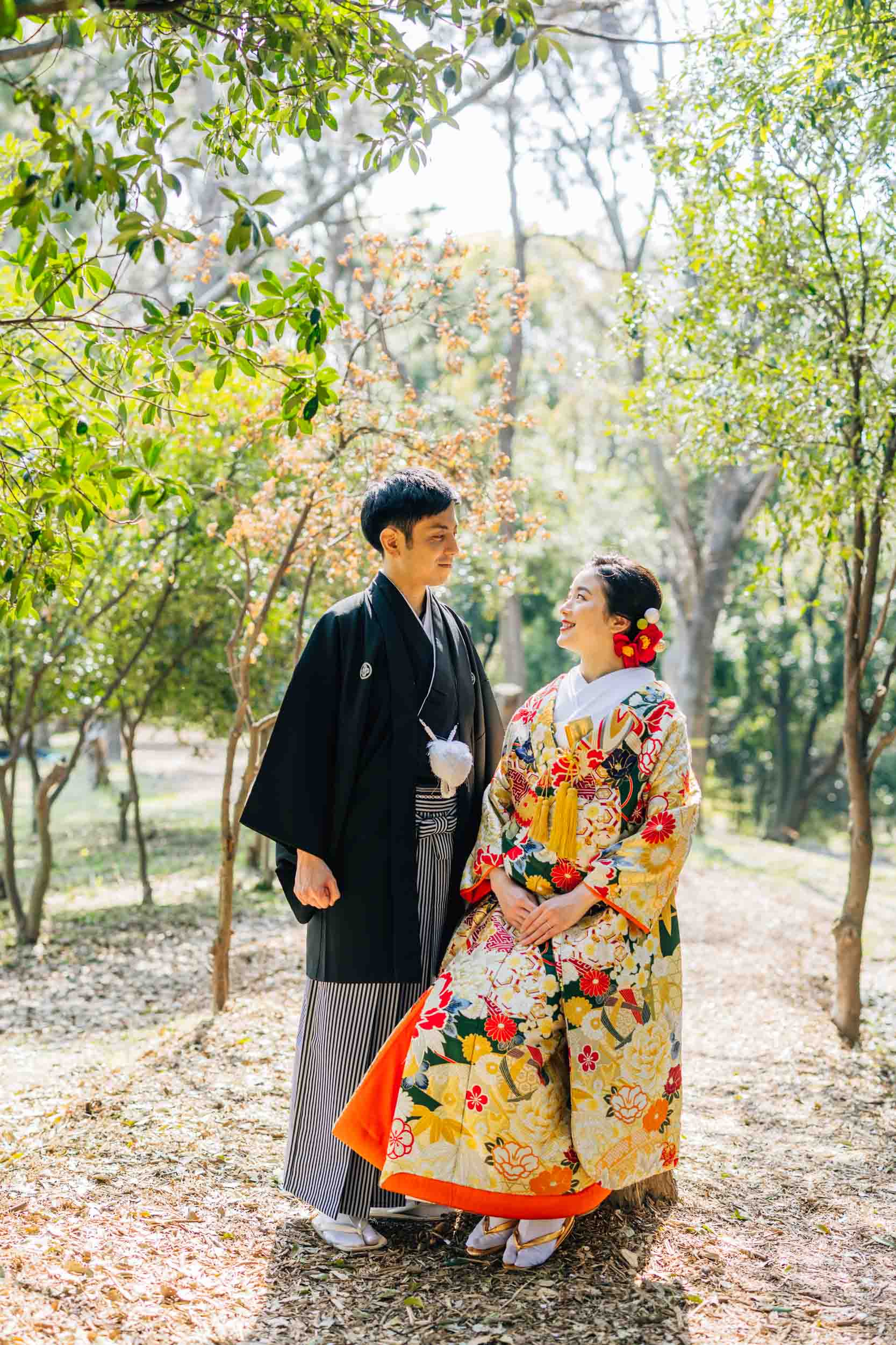 今回の前撮りでは、ウェディングドレスとタキシードによる洋装前撮りと、色打掛を用いた和装前撮りの両方を組み合わせたロケーション撮影を行いました。